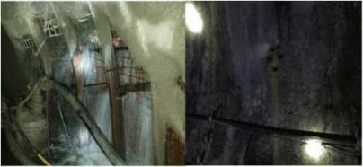 施工过程中在主斜井和副斜井处出现大量涌水。在主斜井 580m 处涌水量 80m3/h;在副斜井 1273m 处涌水量 120m3/h。为了对孔内涌水情况进行综合治理,使用同人材料进行注浆堵漏,下图为主副井治理前后对比。